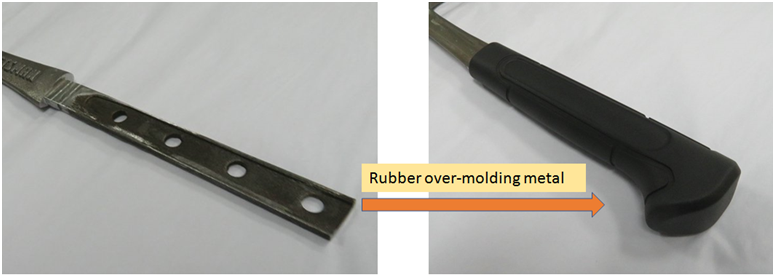 Compared with insert molding, the second plastic changed from rigid plastic to rubber. The first metal part can be produced by formed, CNC machining, die casting.